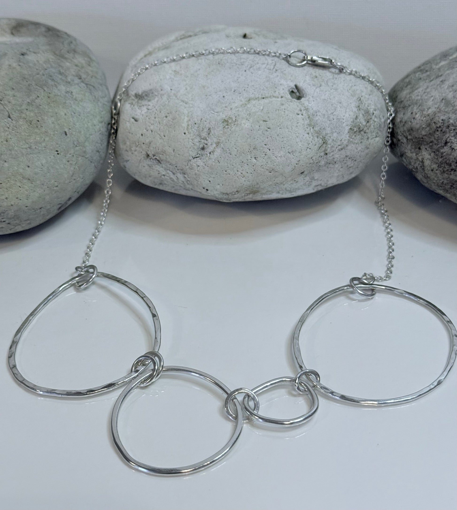 A real statement piece of 4 organic hoops, each hoop has been handmade and has taken it's own individual shape. The 4 hoops hang from a fine chain and can be worn at at 18 inches or 20 inches.