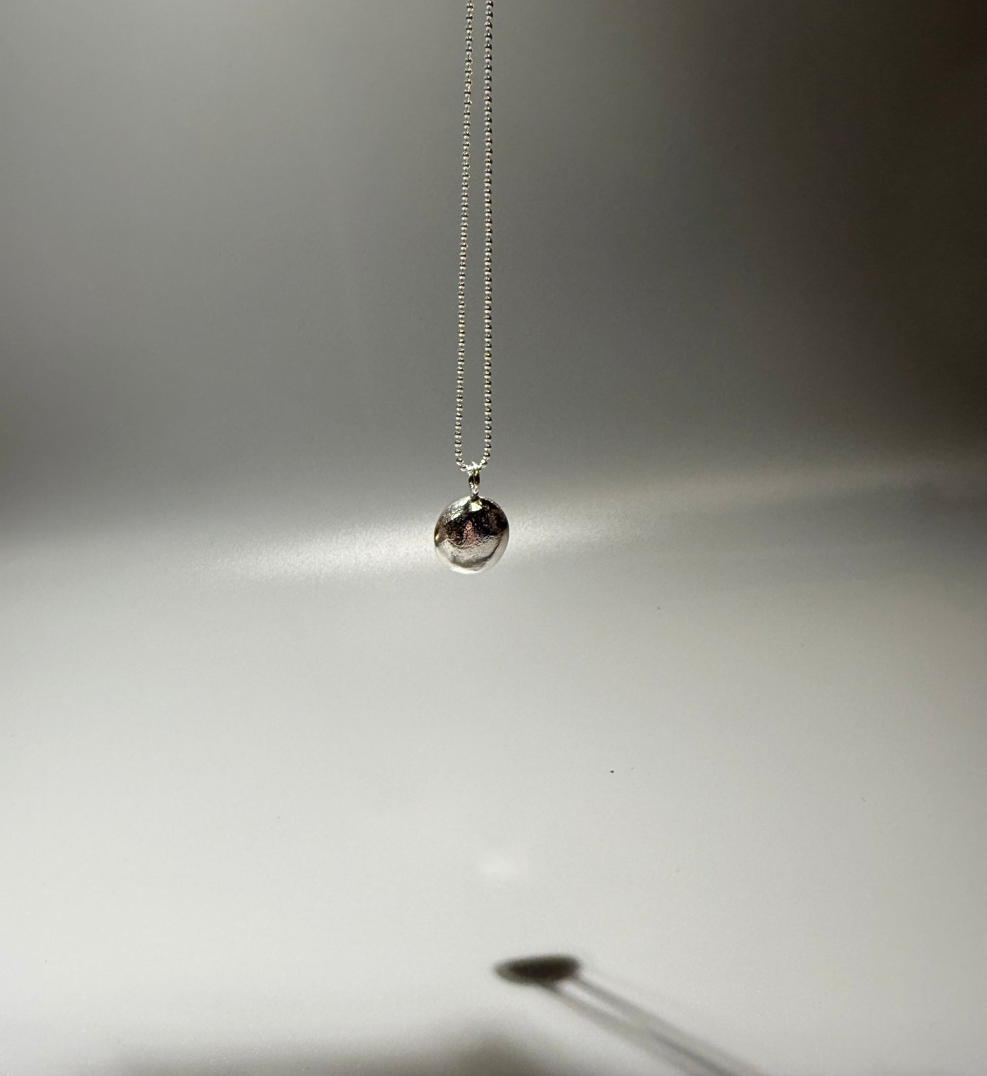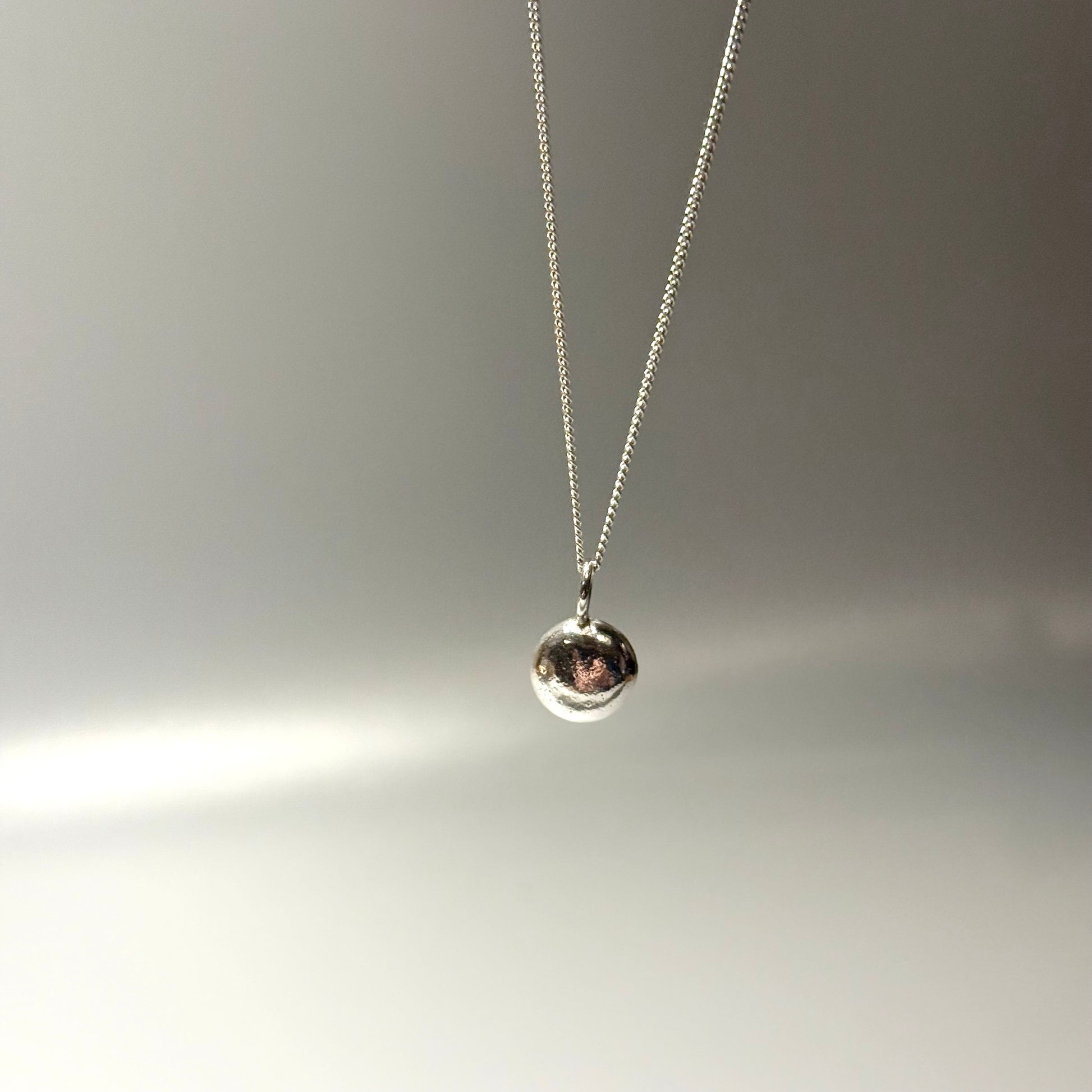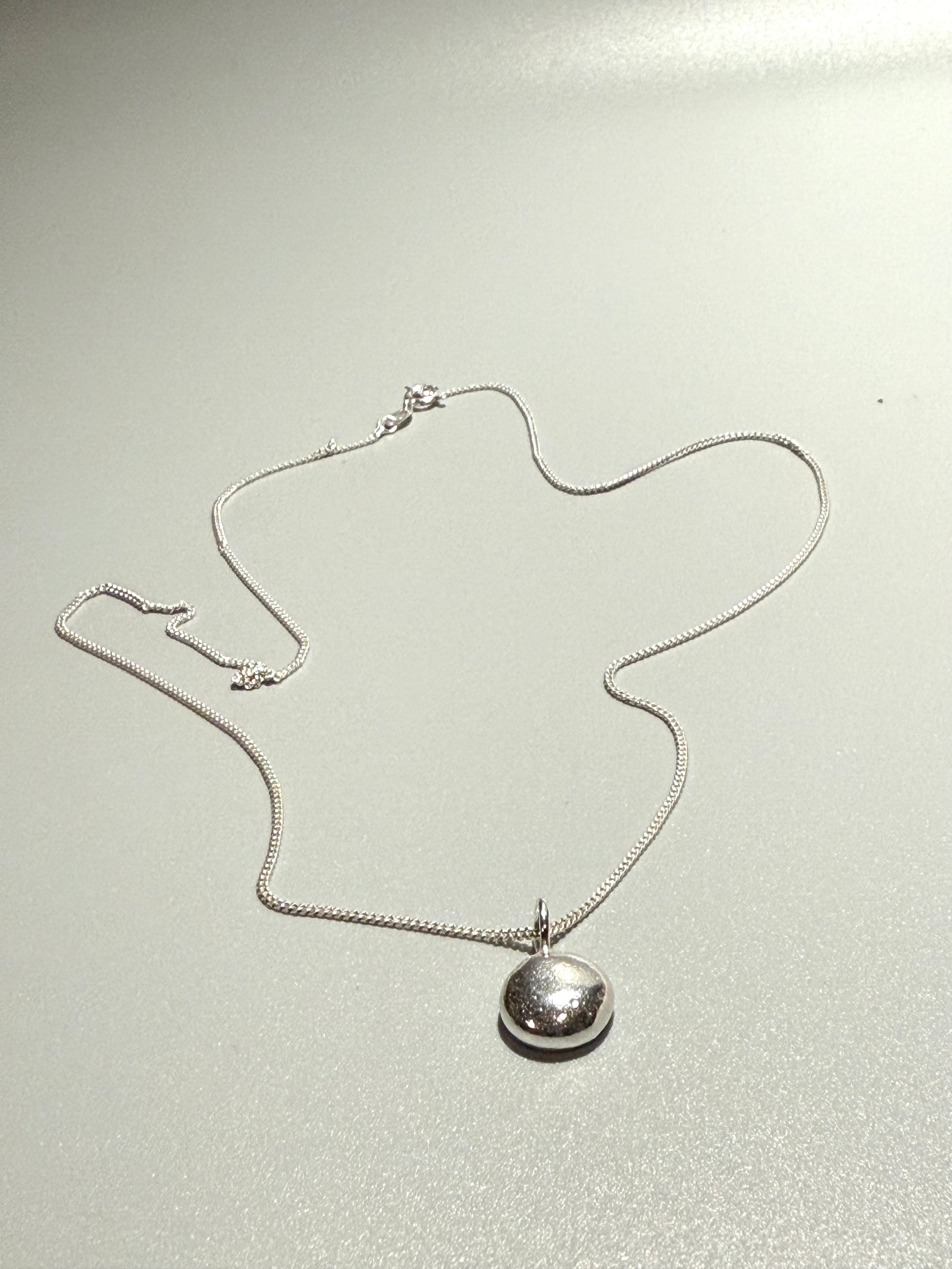 The pebble is made from Sterling Silver and has a slight texture on the front. The molten process is evident by the organic texture on the front and back of the pebble.