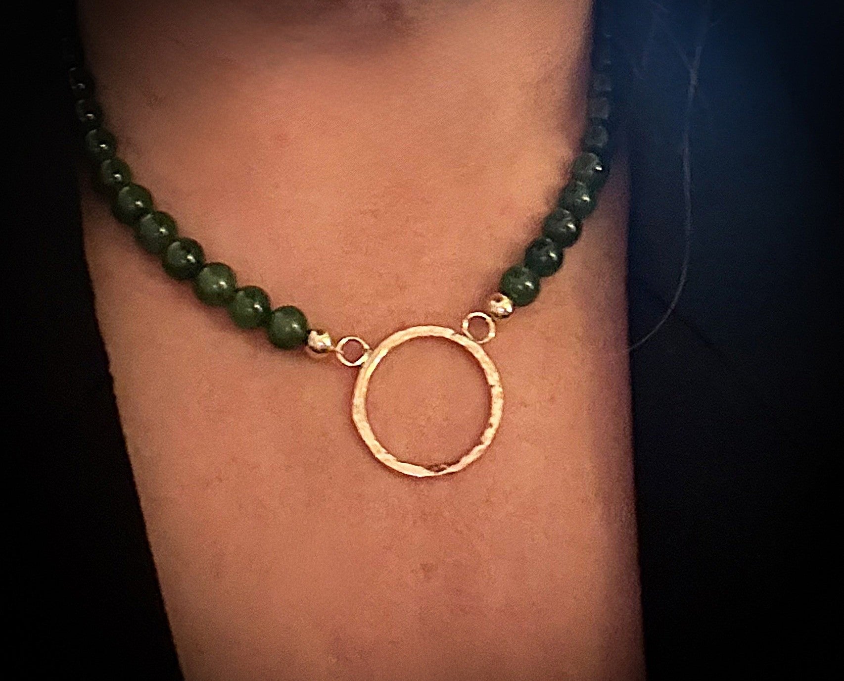 Beads of nephrite sit balanced with a central gold filled circle that has a light catching hammered finish. This necklace transitions from dawn to dusk with ease and works well as statement piece if worn on it's own, or as the perfect addition to a layered look.