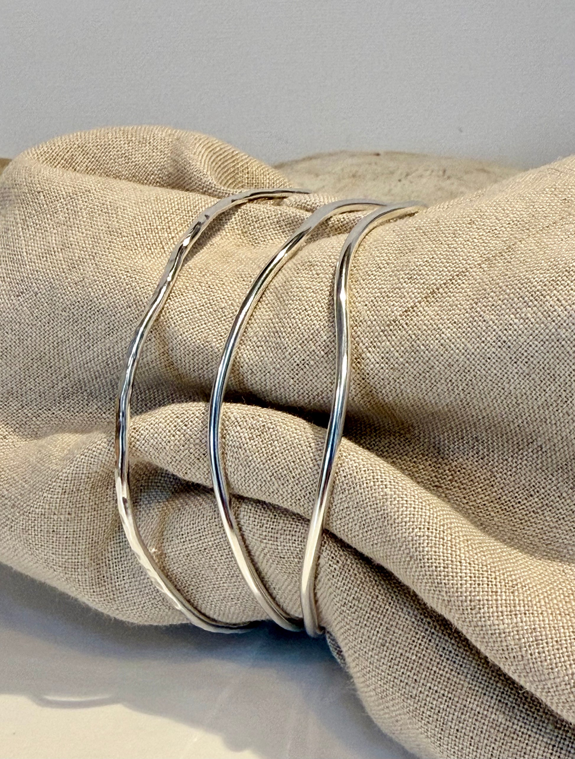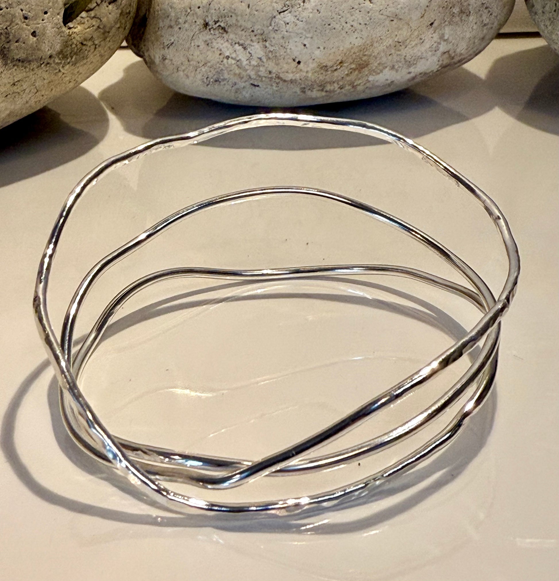 Three wraps of 2mm silver form this one of a kind silver bangle and gives an airy appearance whilst remaining strong. The wraps are fixed in 2 places to give security and strength but also allows for a slight spring the upper part of the bangle.