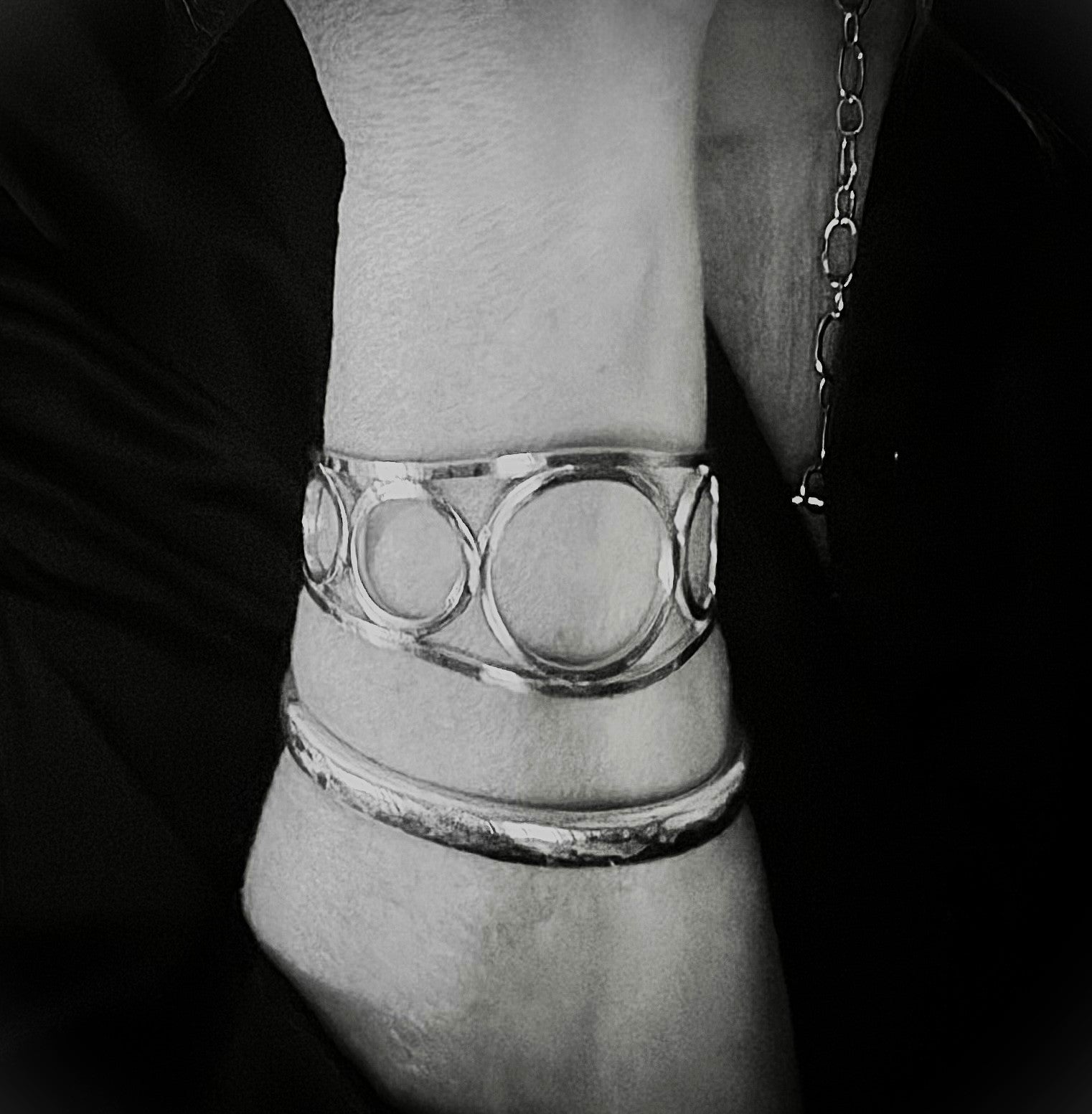 A little bit edgy, this sterling silver cuff forms 5 circles held in a frame of 2mm x 2mm square silver. Each circle has been handmade and lies flat within it's frame.