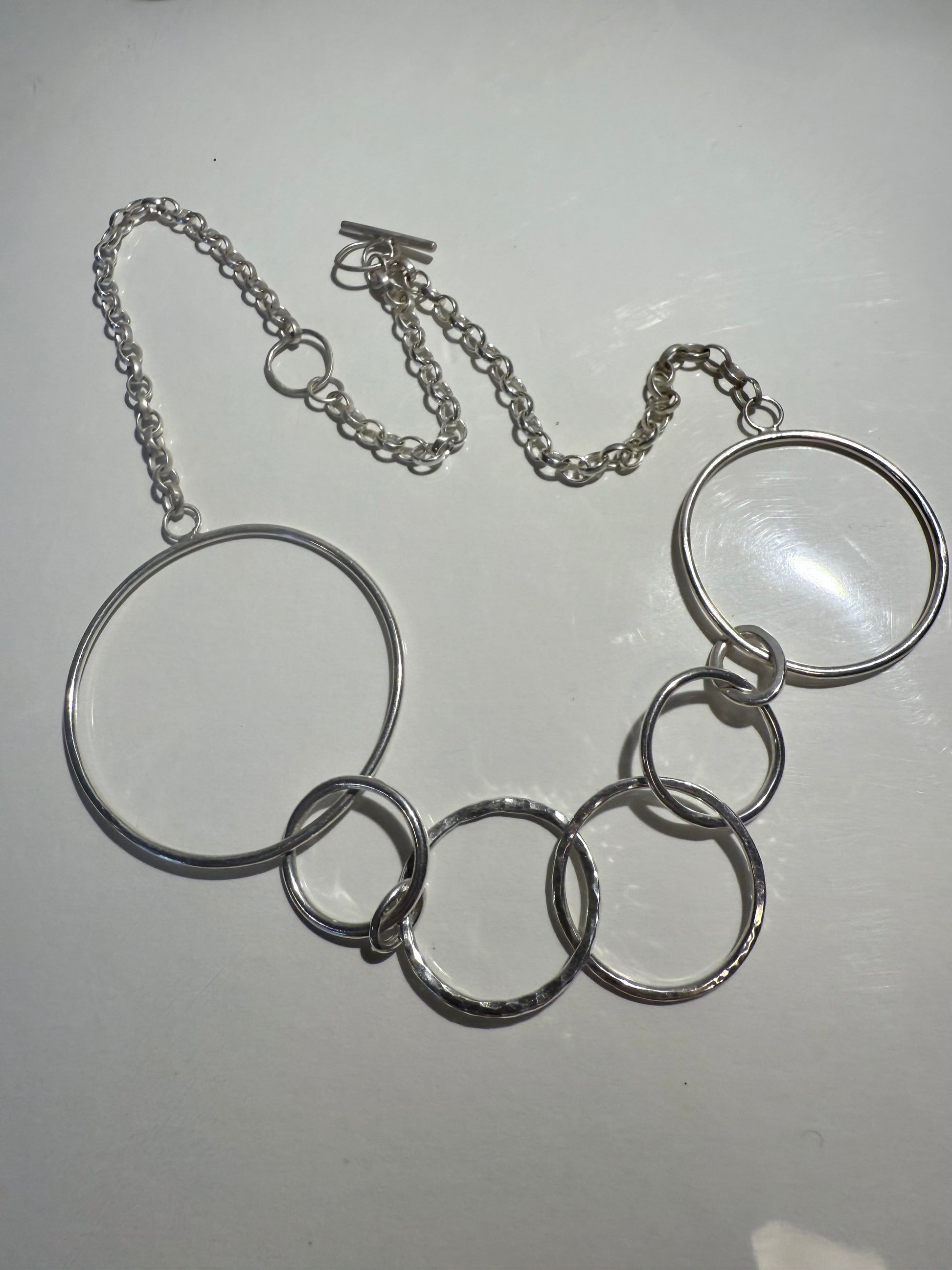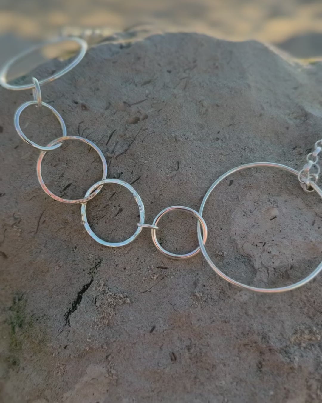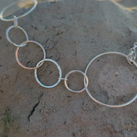 A little bit bohemian and a little bit timeless. A silver necklace of 6 hoops in a mix of plain and hammered texture. The hoops are connected by smaller oval links and hang from a belcher chain with a fine T Bar closure. It can be worn at a length of 20 inchers or 17 inches. Although the circles are large, this piece has a soft and natural flow.