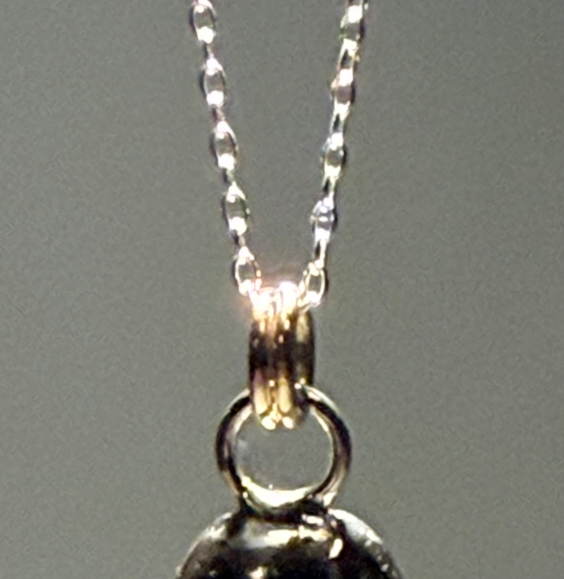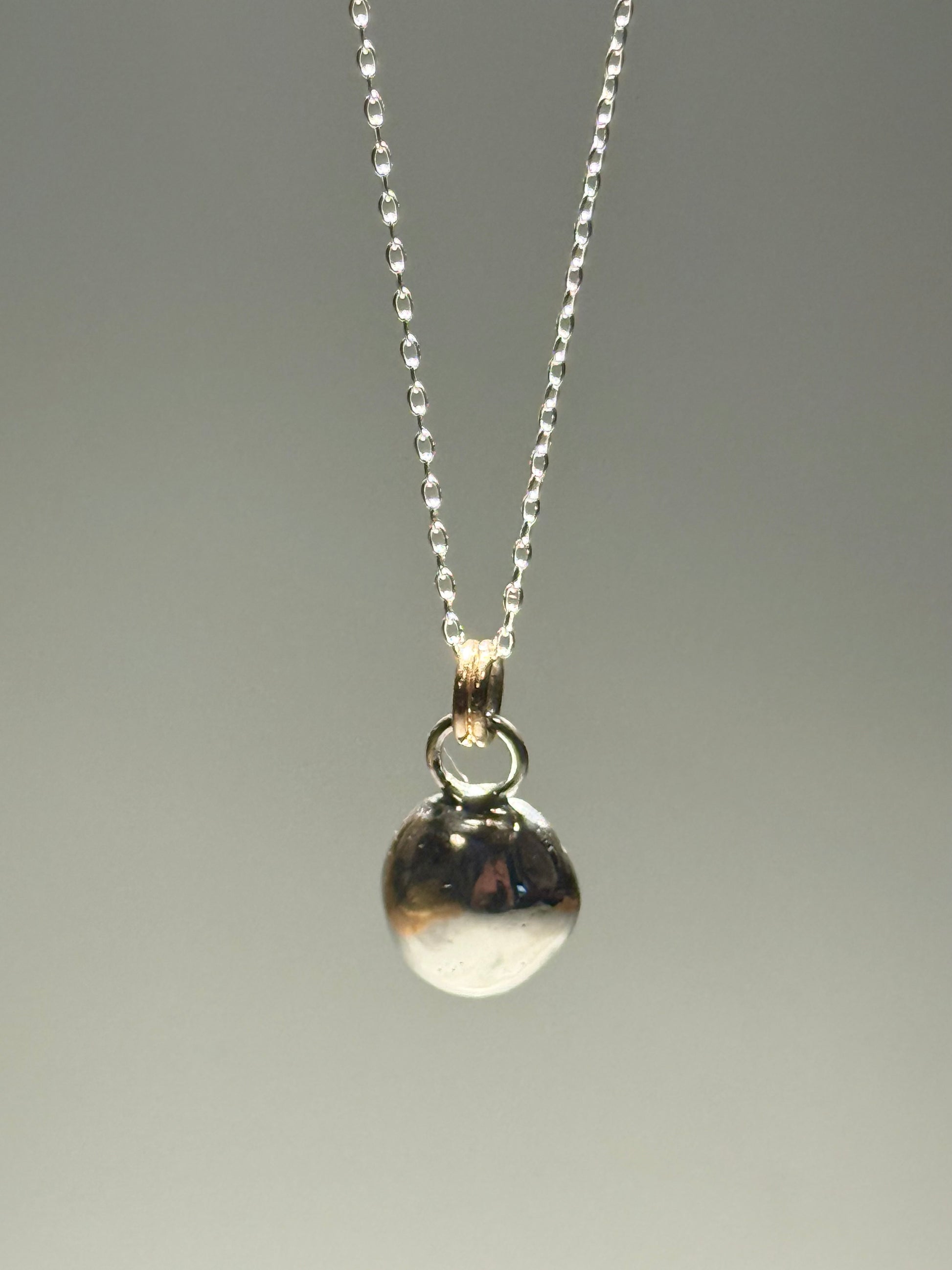 The pebble is made from Sterling Silver, the molten process is evident by the organic texture on the back of the pebble. The pebble hangs from two gold filled jump rings.